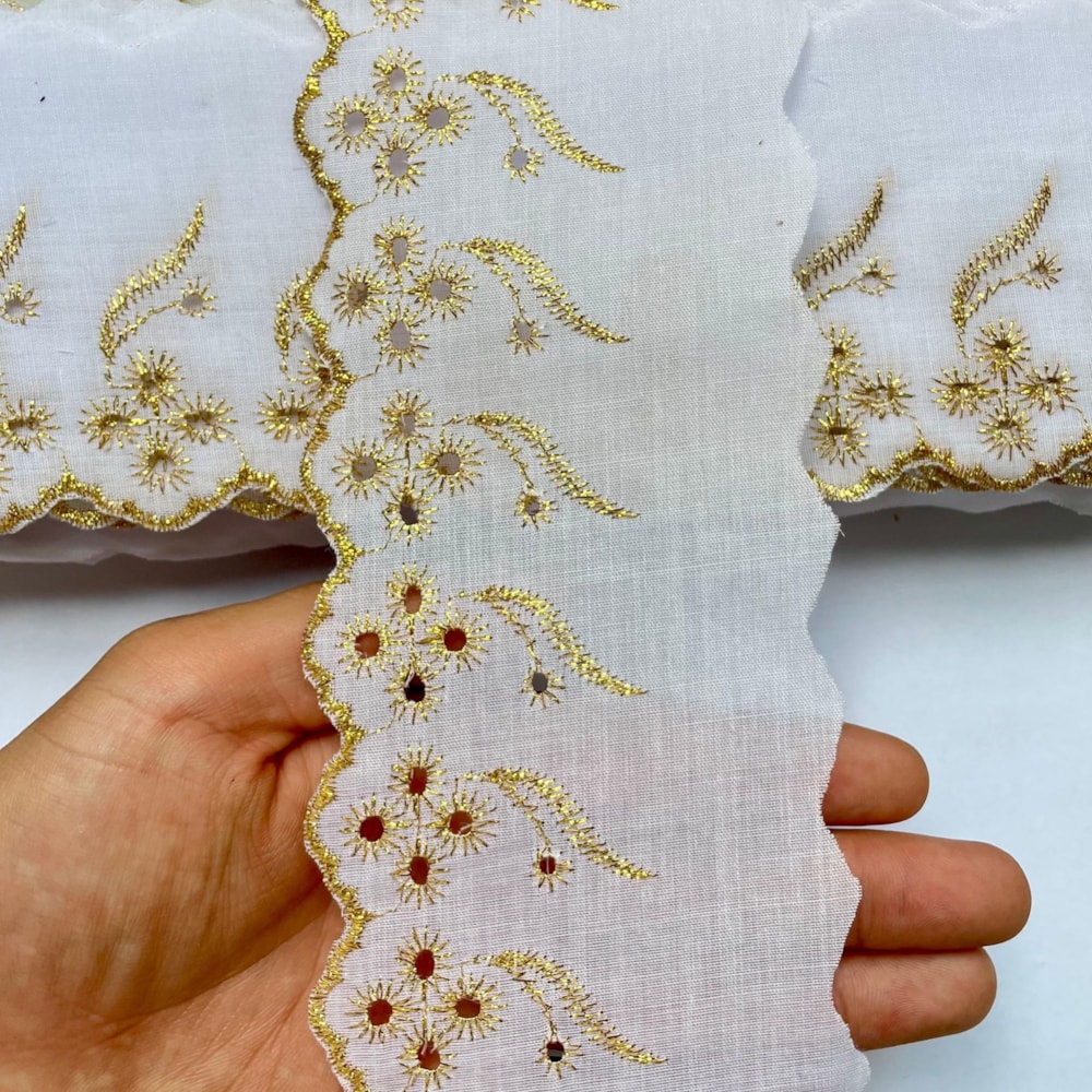 Costura à máquina ou à mão: O bordado inglês pode ser fixado tanto à mão quanto à máquina. Utilize um ponto reto ou zigue-zague para garantir melhor acabamento.
