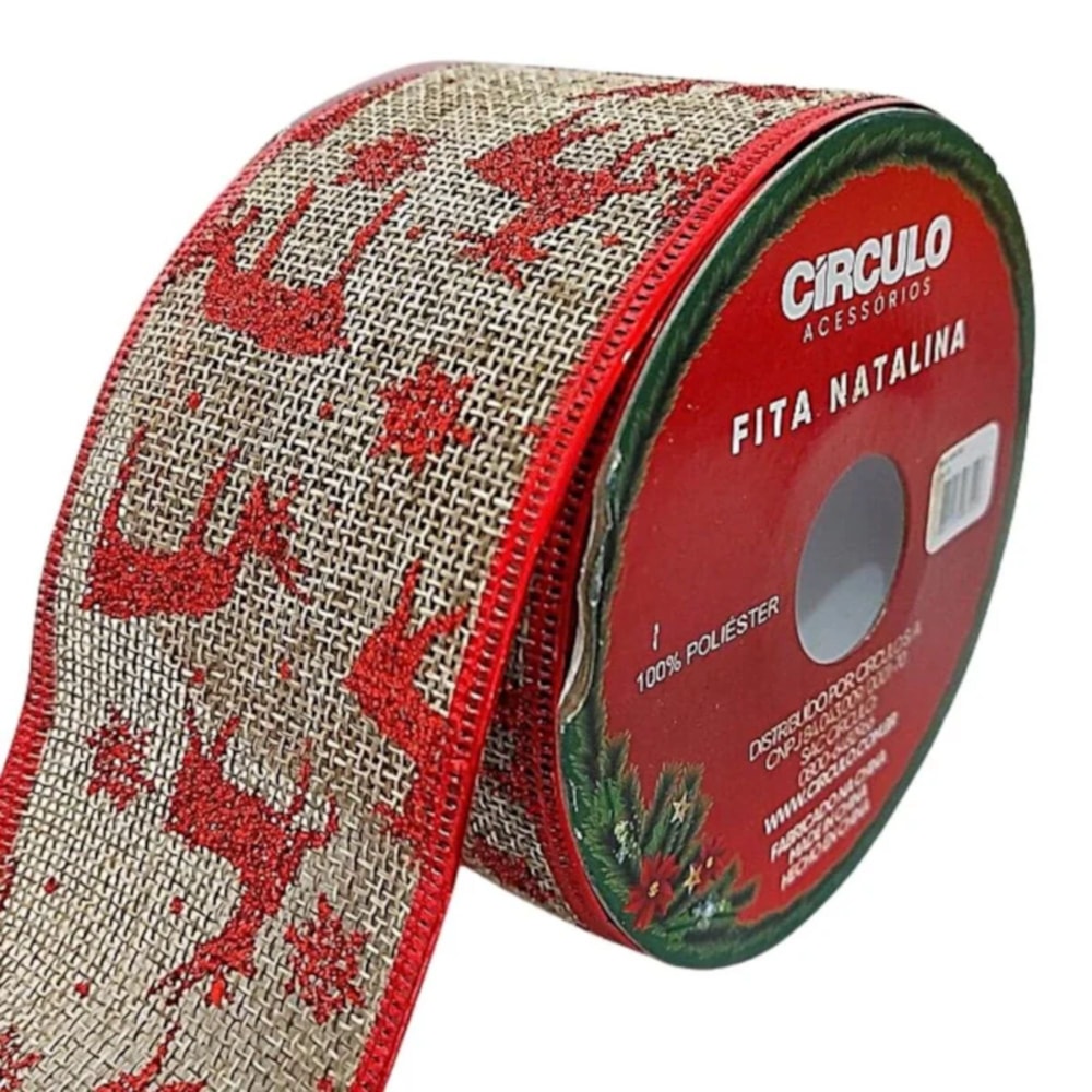 Com largura de 63,5mm, comprimento de 10 metros e peso aproximado de 130g, a fita oferece excelente rendimento e pode ser utilizada em diversas aplicações, desde laços decorativos até acabamentos em guirlandas, árvores de Natal, presentes e arranjos. Seu design exclusivo com estampa de renas traz a atmosfera festiva do Natal de forma elegante e delicada, combinando o aspecto rústico da juta com o brilho sutil do poliéster.