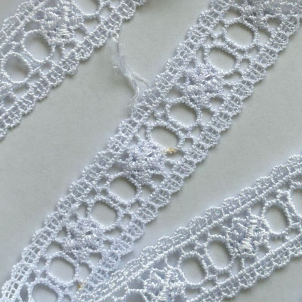 Essa renda é produzida com fios de poliéster de alta qualidade, que proporcionam resistência ao desgaste, facilidade de manuseio e manutenção da aparência original mesmo após lavagens. Sua estrutura encorpada facilita a aplicação em tecidos variados, desde algodão e tricoline até cetim, tule e malha.