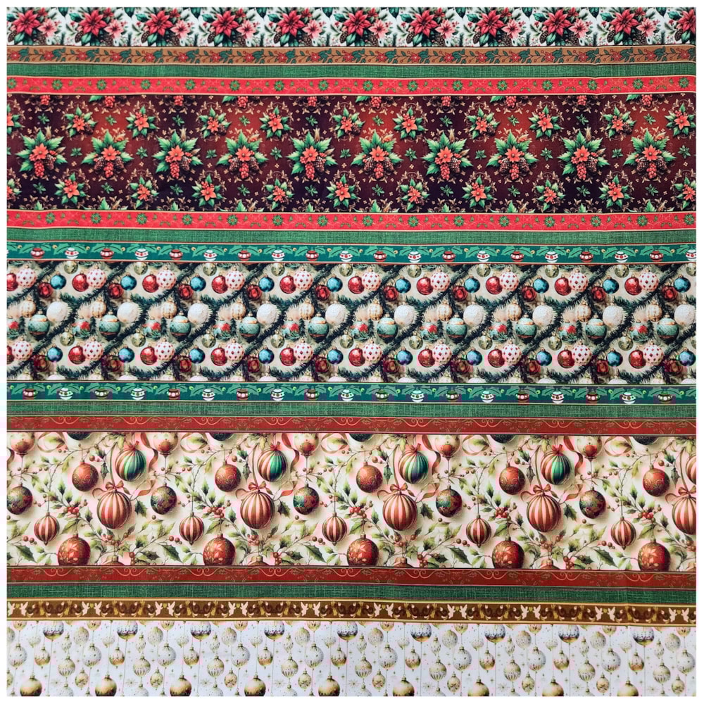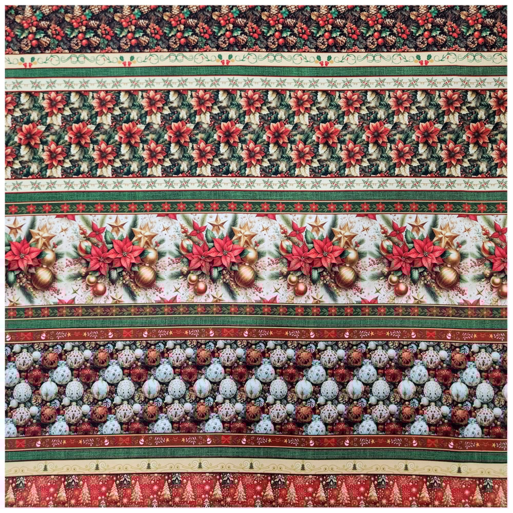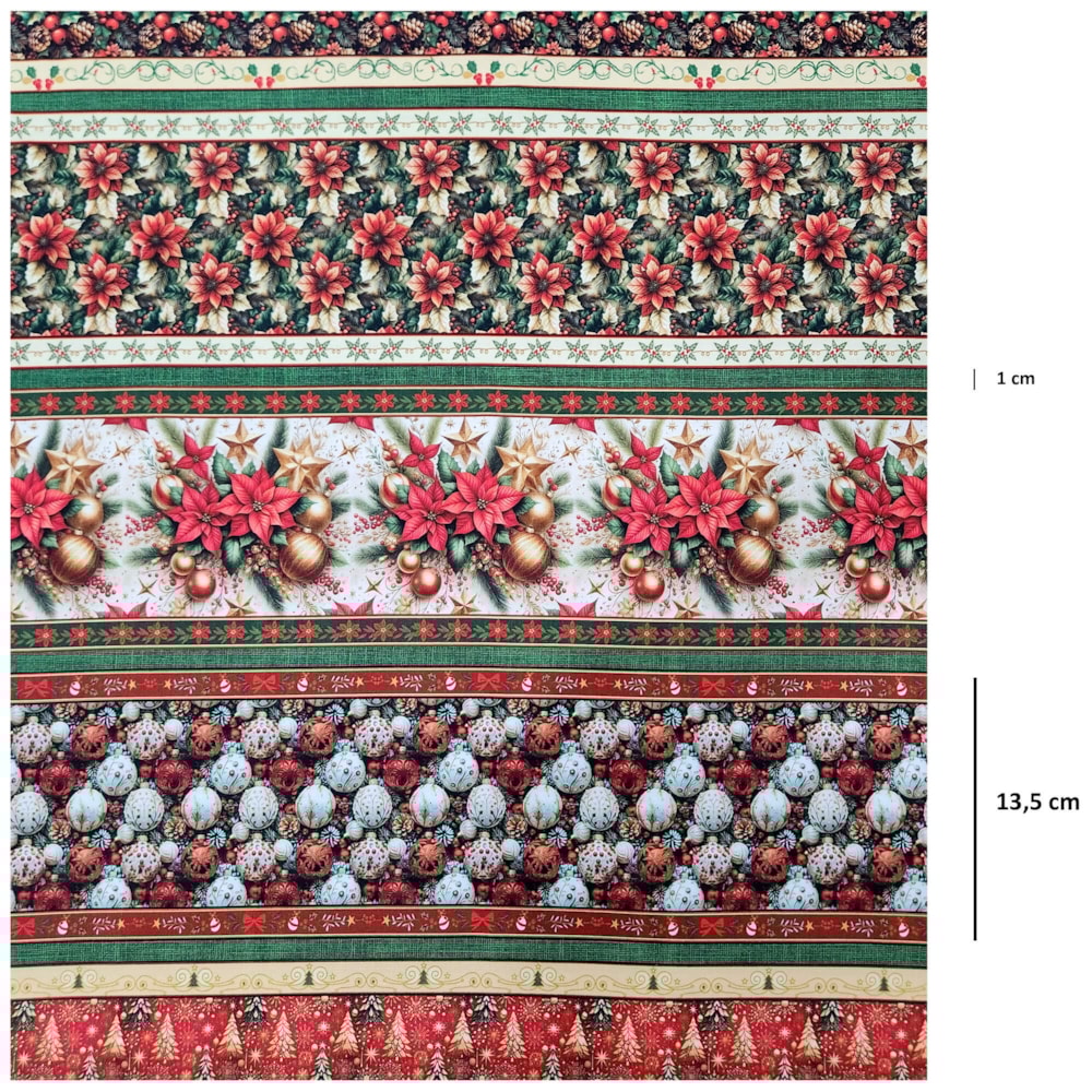 O tecido barrado digital se diferencia por apresentar uma faixa estampada na borda, com desenhos natalinos temáticos, ricos em detalhes e cores vivas, obtidos através da moderna tecnologia de estamparia digital. Essa técnica garante imagens mais nítidas, cores vibrantes e um toque suave, mantendo toda a maciez e respirabilidade natural do algodão.