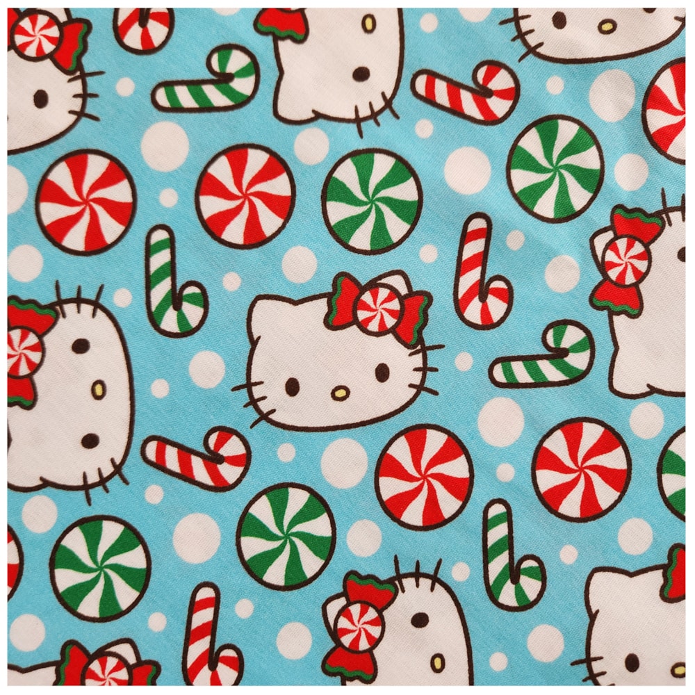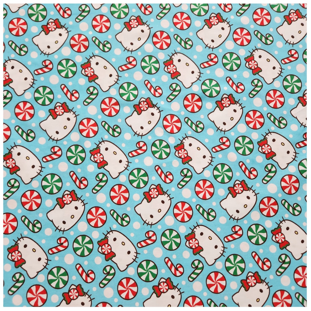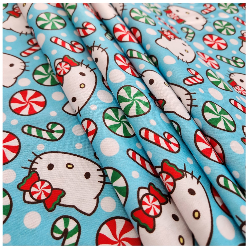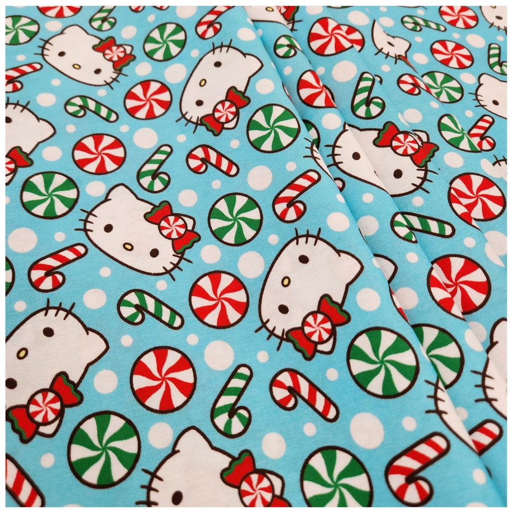 Com largura de 150cm e comprimento de 50cm, o tricoline Hello Kitty oferece excelente aproveitamento, sendo ideal para quem busca um tecido fácil de manusear, com toque macio e cores vibrantes. Sua estampa exclusiva apresenta o icônico rostinho da Hello Kitty, acompanhada de doces e bengalinhas natalinas em tons de vermelho, verde e branco sobre um fundo azul claro com poás brancos — uma combinação perfeita para celebrar o Natal com charme e fofura.