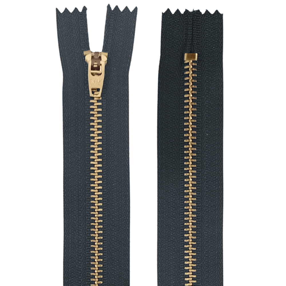 Modelo: Zíper fixo com dentes metálicos dourados